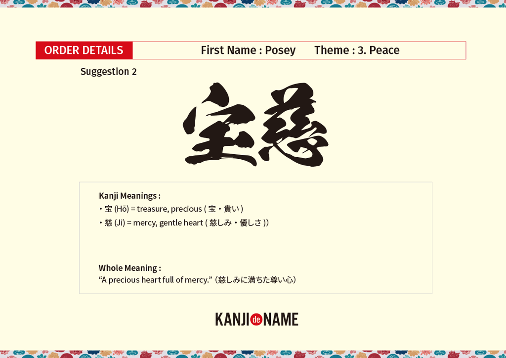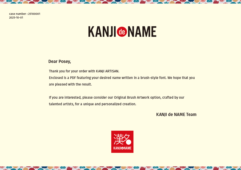 With KANJI ESSENCE, you’ll receive two different kanji options for your name, crafted around a theme of your choice. The ordering process is smooth and simple, and your personalized kanji will be delivered as a convenient PDF file. (Enjoy a quick turnaround so you can start using your kanji name right away.)